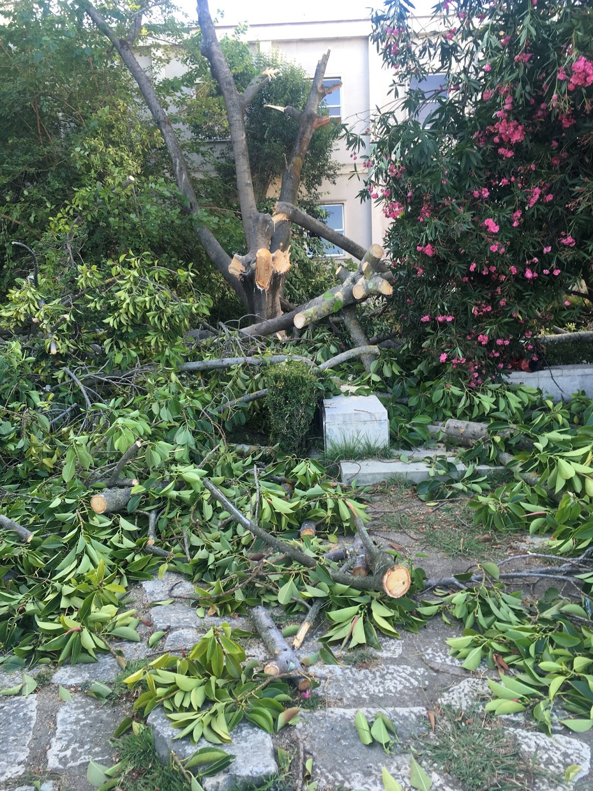 Assim, contactada a nossa empresa de manutenção de Espaços Verdes, procederam-se às intervenções que natureza mais urgente, sendo que durante o dia 13 e 14 realizou-se limpeza dos ramos partidos e esgalhados, que se encontravam no chão e pendurados, pelo que a intervenção realizada se limitou estritamente à zona que tinha danos resultantes da já referida quebra de pernada, tratando-se pois de um exemplar com um grande valor patrimonial.