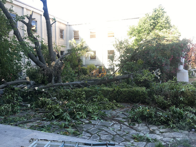 Os alunos estão indignados com a forma como a faculdade iniciou as obras no edifício , cortando todas as árvores de grande porte"